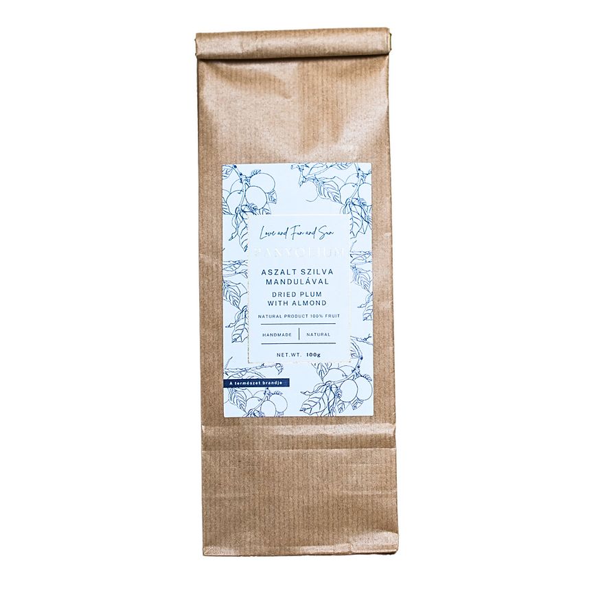 A magyar aszalt panyolai szilva Balaton-felvidéki mandulával töltve különleges, natúr aszalvány, amelyben a zamatos aszalt szilva és a karakteres mandula íze harmonikusan egészíti ki egymást. A termék nem tartalmaz kén-dioxidot, hozzáadott cukrot és tartósítószert, ezért azoknak is jó választás lehet, akik egyszerű összetételű, természetes finomságot keresnek.